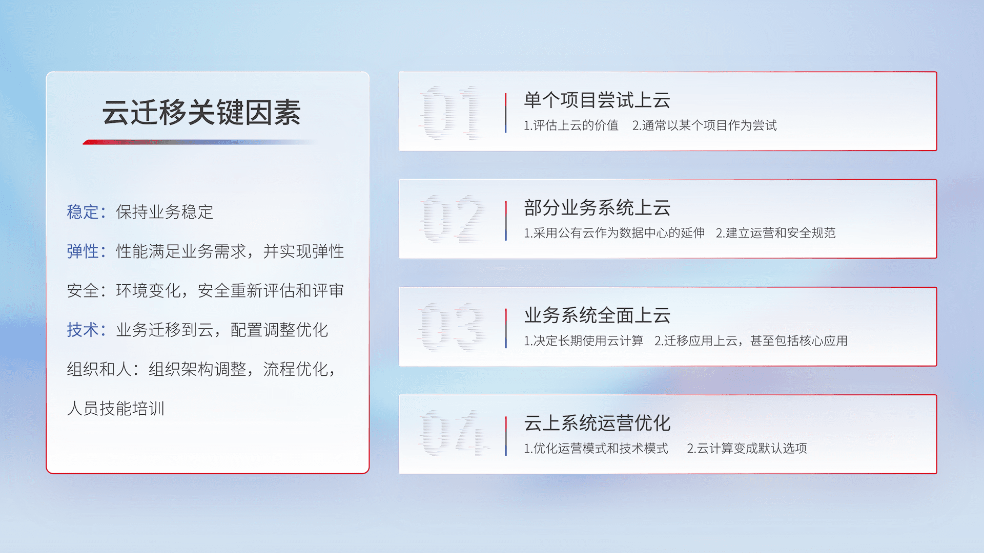 结合实际业务,,,从规划设计、、、云平台选型、、、云原生改造、、、数据迁移、、、集成交付,,,,迁移全过程为客户识别最佳上云路径,,,做好风险识别管理,,设计网络架构、、、、身份权限、、、、安全审计合规、、操作审计、、、、日志审计、、、监控告警策略、、、、多站点容灾设计等,,,对云上基础设施进行整体规划,,,提升IT治理水平,,以满足弹性、、、、高可用、、、、高性能的需求。。。